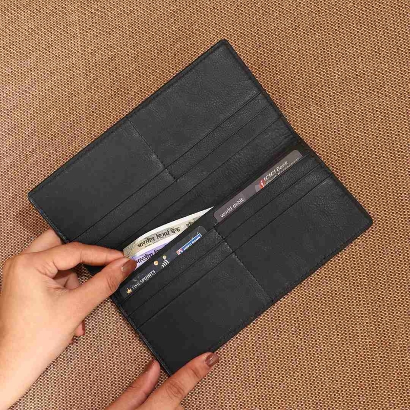 Crafted from gorgeous leather, it has 10 card slots, which offers ample space for all your important cards, while the 2 currency pockets provide room for cash, making it ideal for those who need both functionality and compact storage. Like a classic card organizer, Max ensures everything is neatly in place, perfect for your travel needs or daily routine.