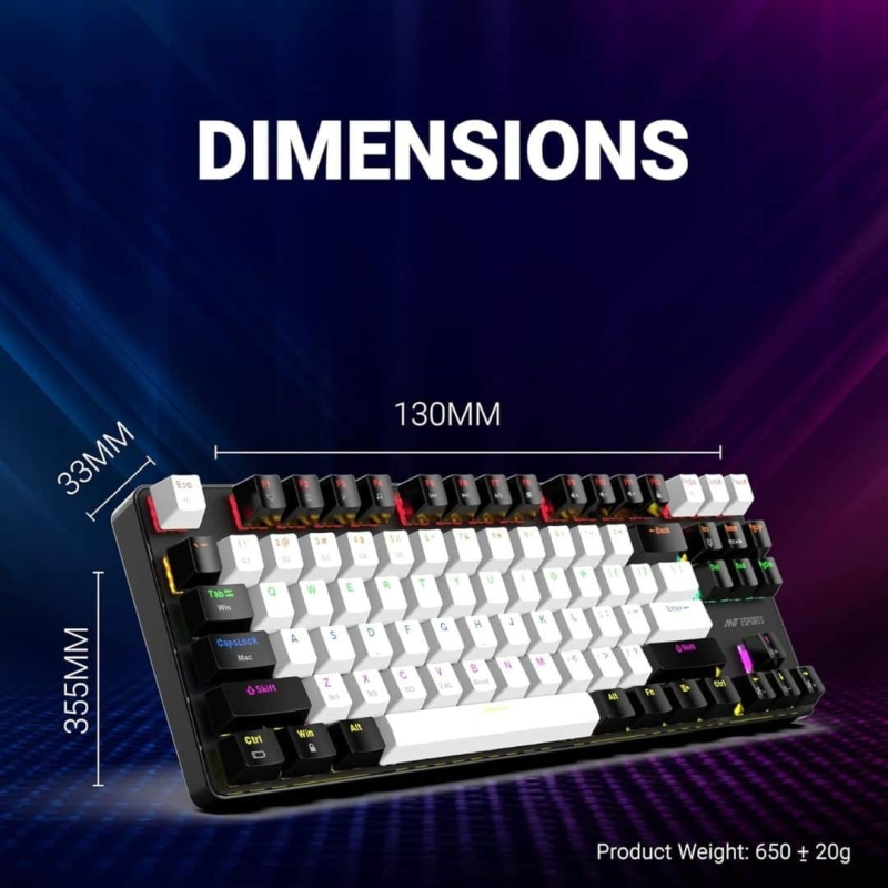The Ant Esports MK4500 Pro is a versatile, compact mechanical keyboard designed for gamers, offering three modes of connection: 2.4GHz wireless, Bluetooth, and USB-A wired. It features 87 keys, customizable LED backlighting with 10 lighting modes, and detachable frames for customizable setups. With durable construction, it supports up to 10 million clicks and is compatible with Windows, MacOS, and Android. This high-performance keyboard is ideal for gaming, offering both functionality and style in a compact TKL form factor.