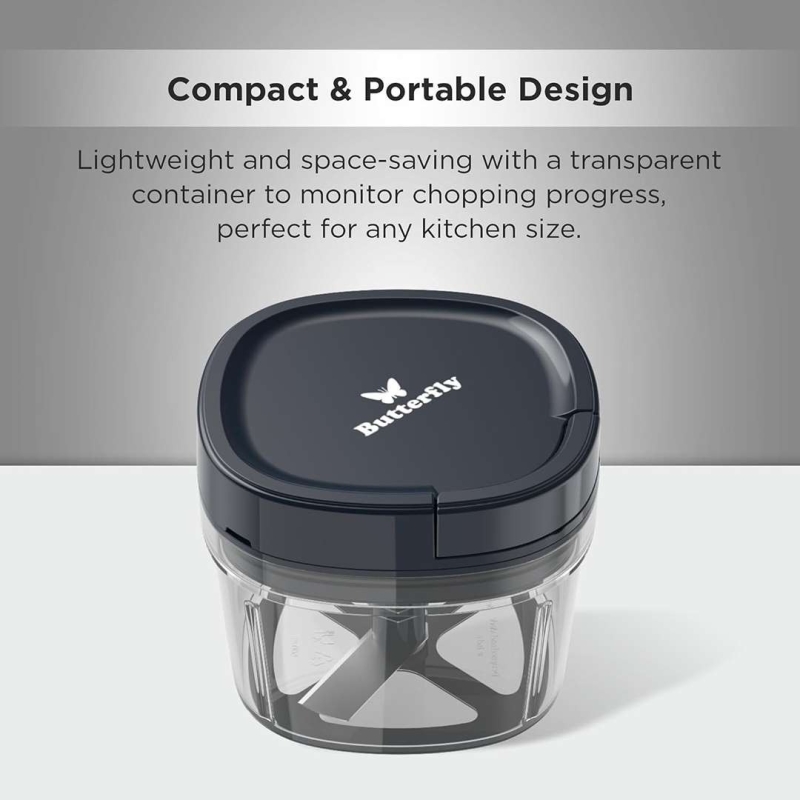 The Butterfly Premium Manual Vegetable Chopper is a compact and efficient tool designed for fast chopping of vegetables. Its durable plastic body and sharp stainless steel V-shaped blades ensure easy and quick food prep. Ideal for daily kitchen use with a 600 ml capacity and user-friendly manual operation.