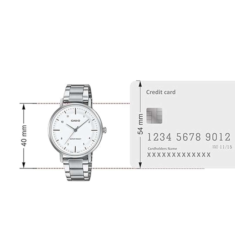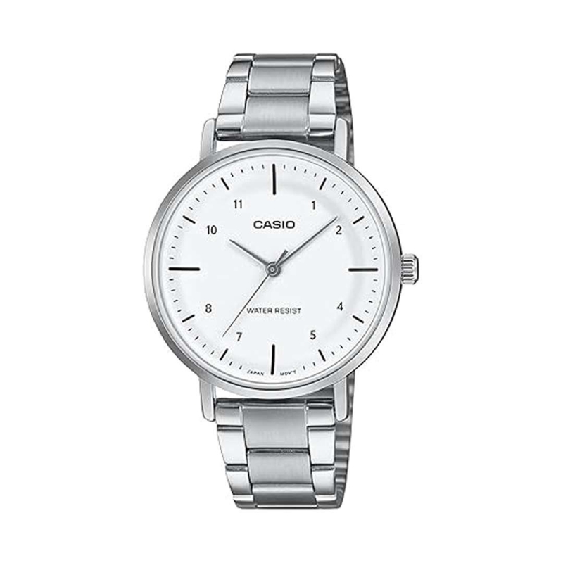A refined timepiece for the modern woman, the Casio LTP-VT03D-7BDF features a minimalist white dial encased in a durable stainless steel body. Its concave-shaped dial offers depth and elegance, while the silver stainless steel strap with a double locking foldover clasp ensures a secure and stylish fit. With water resistance for daily use and a lightweight design, this watch is perfect for effortless everyday wear.