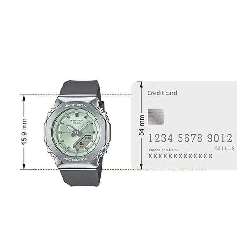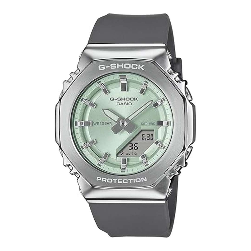 The Casio GM-S2110-3ADR is a stylish, eco-conscious women’s analog-digital watch designed for modern minimalists. Featuring a bold green dial with a gray bio-based resin strap, it sports the iconic octagonal metal bezel with a slimmer, more compact design perfect for slimmer wrists. This watch blends fashion with functionality, offering features like World Time, Alarm, Chronograph, and Shock Resistance. Crafted with mineral glass and water resistance, it’s a lightweight and reliable timepiece made using renewable bio-resin materials — a smart choice for both your wrist and the environment.
