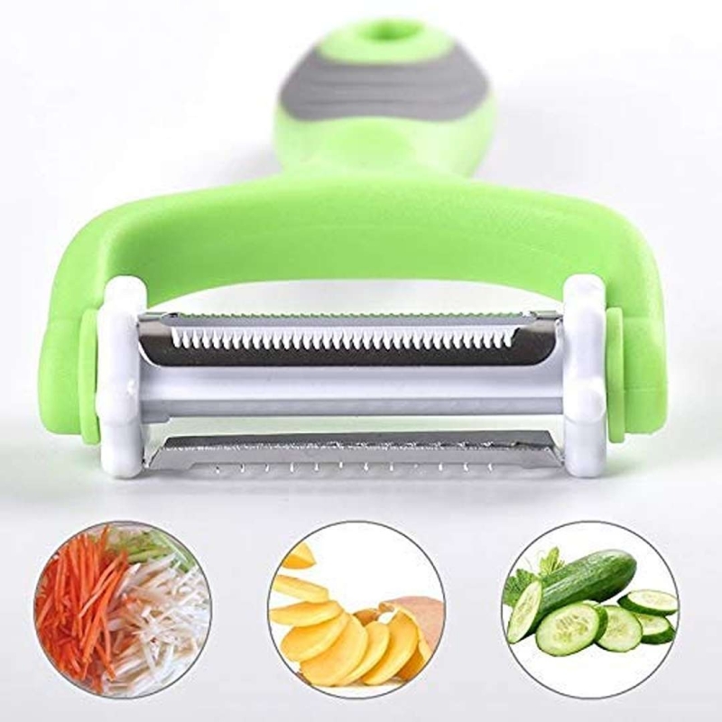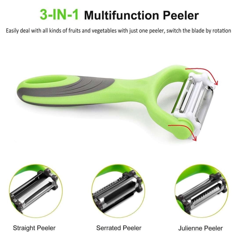 Peel with ease using this versatile 3-in-1 peeler featuring stainless steel straight, serrated, and julienne blades. Ideal for potatoes, carrots, cucumbers, apples, and more, it offers a non-slip grip for safe, effortless use. Made from food-grade materials, it's a durable, manual kitchen essential. Available in green or black.