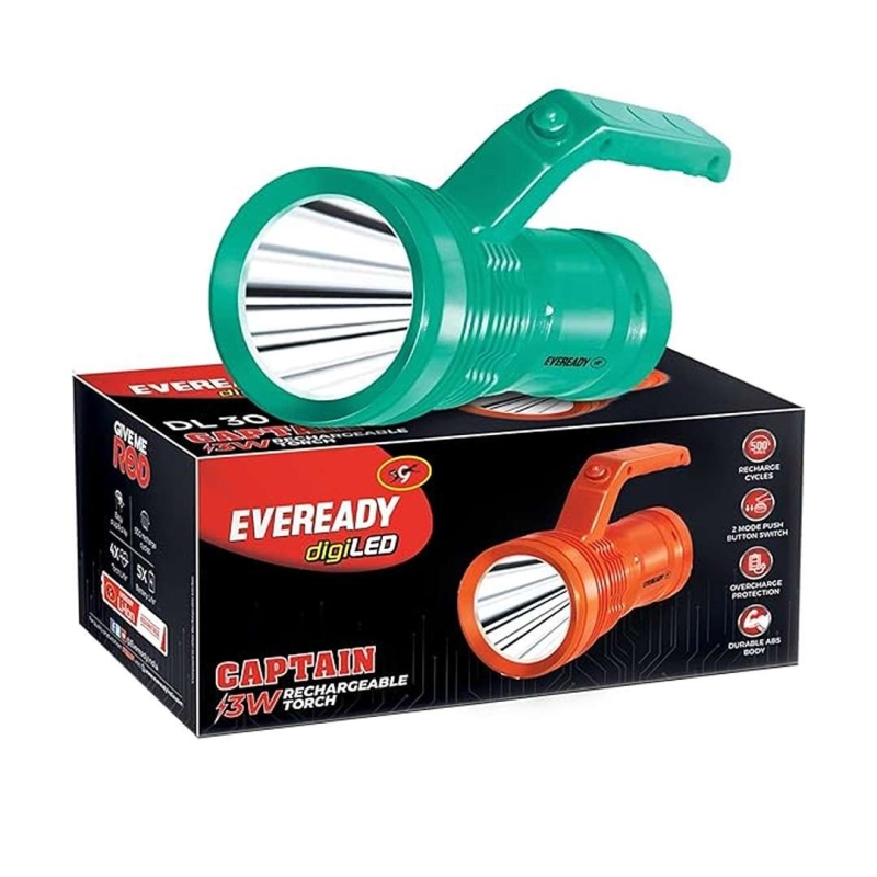 The Eveready DIGILED DL30 Rechargeable Torch is a durable, lightweight torch with a scratch-resistant ABS plastic body available in green and orange. It features a super bright 3W white LED producing 3000 lumens, powered by a lithium-ion battery with overcharge and deep discharge protection. With a runtime of up to 8 hours, two light modes, and an ergonomic handle, this torch is ideal for long-lasting, efficient lighting and easy plug-and-play charging.