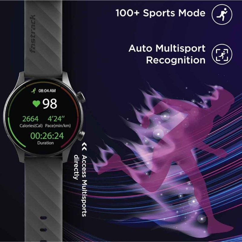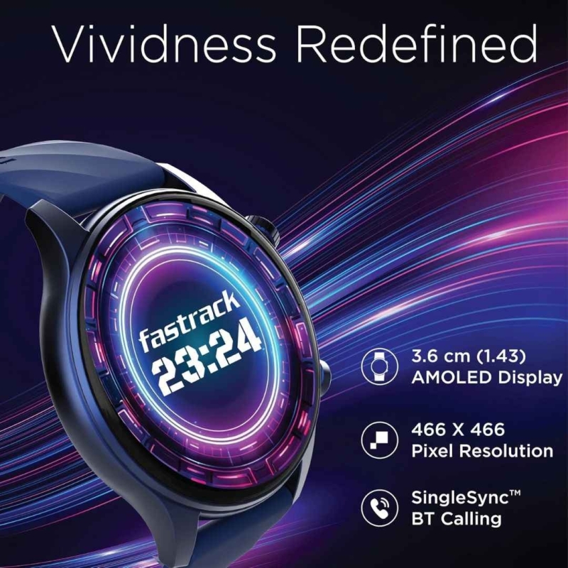 The Fastrack Vivid Pro Smartwatch (Model 38110PP01) is a stylish and feature-packed wearable designed for Android users. It features a vibrant 1.43" AMOLED display, Bluetooth calling (SingleSync), and over 100 sports modes with AI coaching. The watch also includes comprehensive health tracking with 24x7 heart rate monitoring, sleep tracking, SpO2, stress monitoring, and breathing exercises. Additional perks include in-built games, an AI voice assistant, and customizable watch faces. Lightweight and unisex, it's ideal for a range of sports like walking, running, and more.