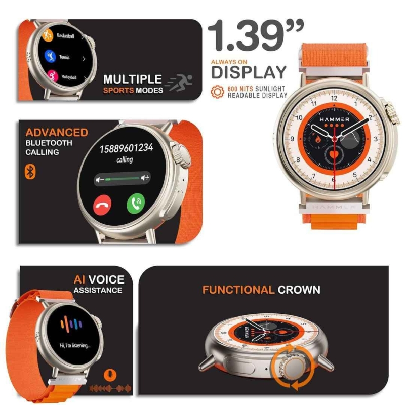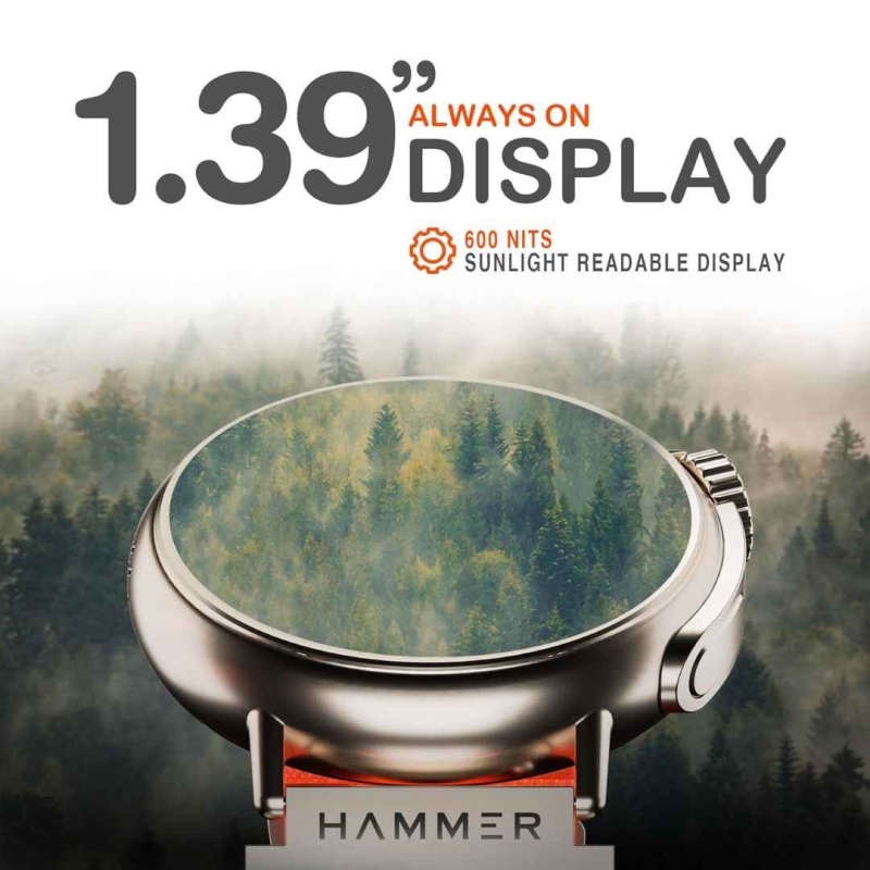 The HAMMER Active 3.0 is a versatile smartwatch designed for those who value style and functionality. Featuring a 1.39" Radiant IPS Always On Display with 240x240 resolution and 600 nits brightness, it ensures crisp visuals in all conditions. Its metallic zinc alloy body paired with a bold Pop Orange strap adds a unique flair to your wrist. Stay connected with Bluetooth 5.1 calling, SOS emergency support, and a range of health monitoring features like Blood Pressure, SpO2, Heart Rate, and ECG tracking. With customizable watchfaces (100+ options), dual-button navigation, and in-app GPS for fitness tracking, the Active 3.0 is your all-in-one lifestyle companion.