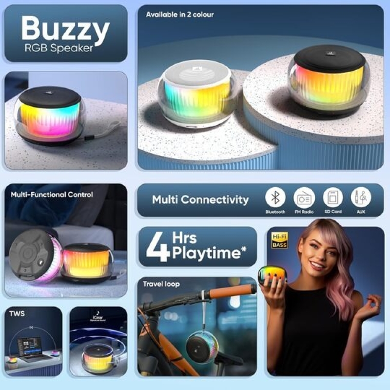 The iGear Buzzy is a compact and stylish portable Bluetooth speaker designed for everyday entertainment. With 5W stereo output, 360-degree RGB lighting, and multiple playback options like Bluetooth, AUX, TF/SD card, and FM radio, it delivers an engaging audio-visual experience. Its lightweight design, TWS stereo pairing, and Type-C fast charging make it ideal for home use, travel, camping, and casual outdoor fun.