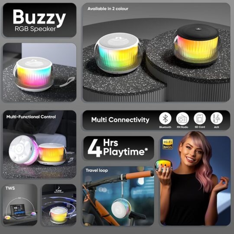 The iGear Buzzy is a compact and stylish portable Bluetooth speaker designed for everyday entertainment. With 5W stereo output, 360-degree RGB lighting, and multiple playback options like Bluetooth, AUX, TF/SD card, and FM radio, it delivers an engaging audio-visual experience. Its lightweight design, TWS stereo pairing, and Type-C fast charging make it ideal for home use, travel, camping, and casual outdoor fun.
