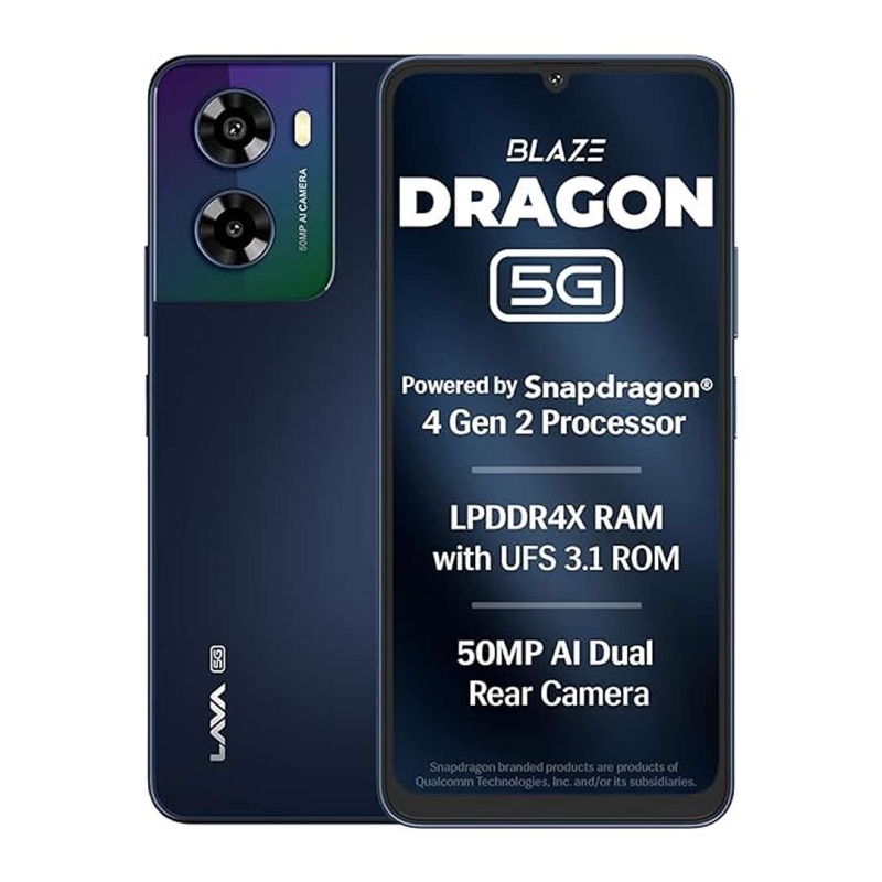 The Lava Blaze Dragon delivers powerful and efficient performance with its Snapdragon 4 Gen 2 chipset and 4GB + 4GB* virtual RAM, paired with fast UFS 3.1 storage. Its 6.75-inch 120Hz HD+ display offers smooth visuals ideal for gaming and streaming. With a 50MP AI rear camera, 5000mAh battery, 18W fast charging, 5G connectivity, and a premium glossy design, it’s a feature-packed smartphone built for speed, multitasking, and everyday reliability.