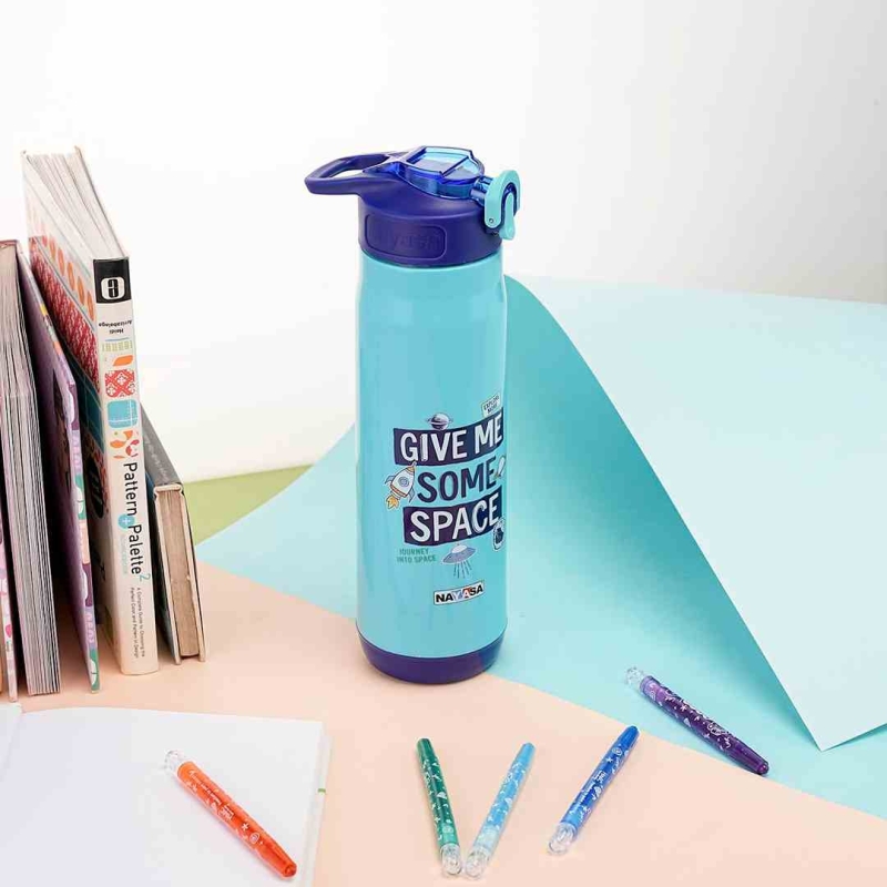 The Nayasa Adonis 620 ml blue insulated bottle features a stainless steel inner body with a durable plastic exterior. Made from 100% BPA-free materials, it is leakproof, reusable, and perfect for safe hydration. Lightweight and stylish, it is ideal for work, school, travel, sports, gym, and everyday use.