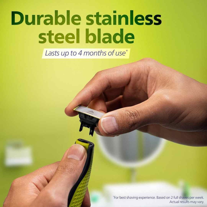 The Philips OneBlade QP2724/10 is a versatile grooming tool designed for trimming, shaping, styling, and shaving any length of facial hair—perfect even for sensitive or acne-prone skin. Powered by a long-lasting battery and a 2X powerful motor, it features a dual-sided stainless-steel blade, waterproof design, and easy blade-replacement indicator, making it ideal for everyday grooming and travel.
