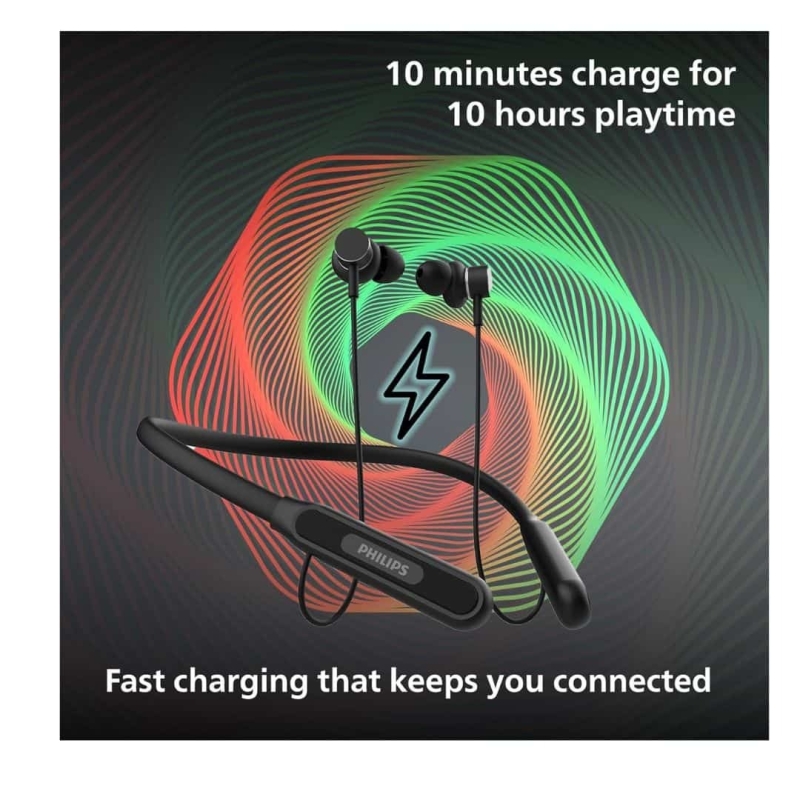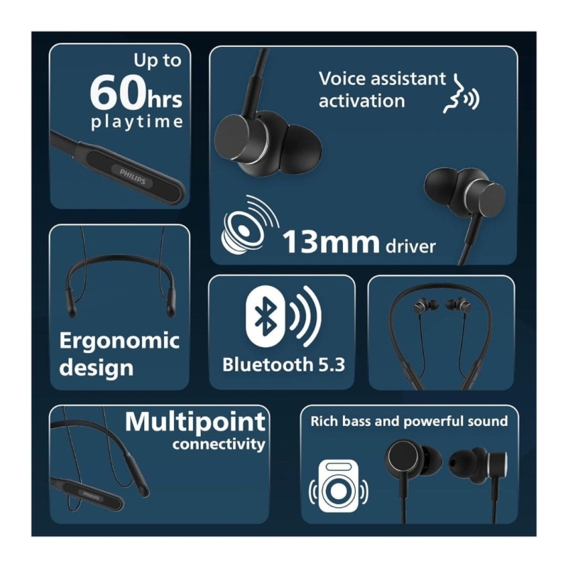 The PHILIPS TAN1150BK/94 in-ear wireless headphones deliver an impressive 60 hours of playtime on a single charge with fast charging for quick power-ups. Featuring AI ENC Mic for crystal-clear calls and 13mm dynamic drivers for deep bass, these headphones provide an immersive audio experience. With Multipoint Connectivity and Bluetooth v5.3, you can easily connect to two devices at once. Enjoy rapid charging, with just 10 minutes providing 10 hours of playback—perfect for on-the-go lifestyles.