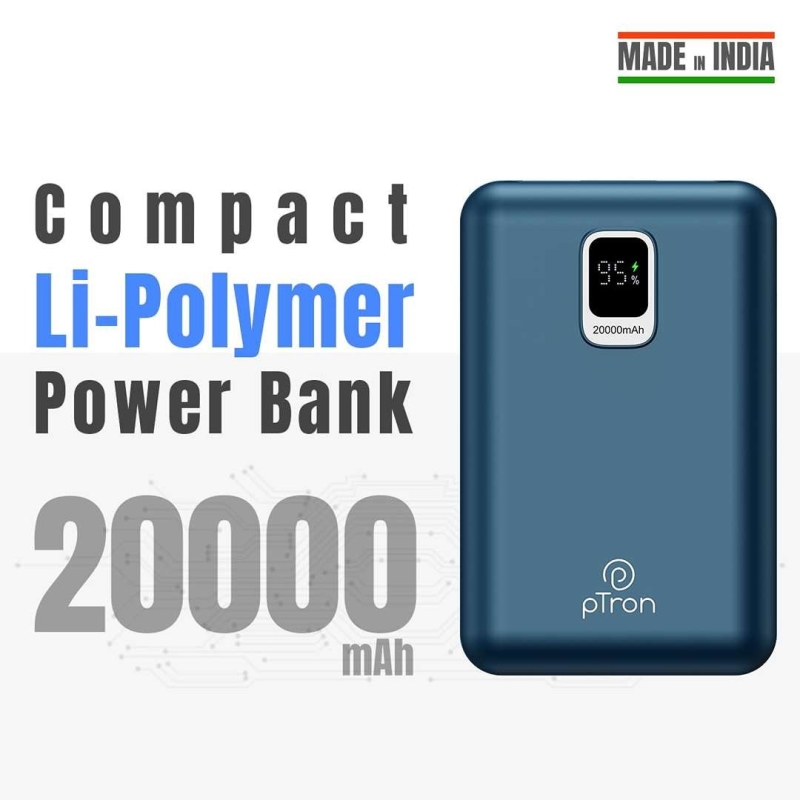 The pTron Dynamo Ultra Compact 20000mAh Power Bank (Blue) is a high-capacity, slim, and portable charger with fast charging, real-time LED battery display, and advanced safety protections. It supports charging up to 3 devices simultaneously and is compatible with multiple fast-charging protocols.