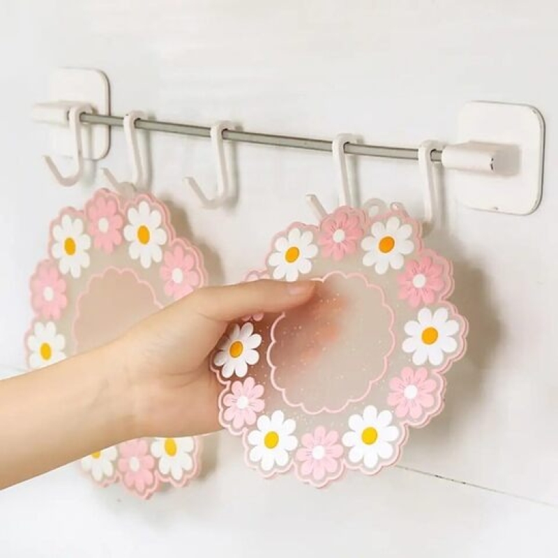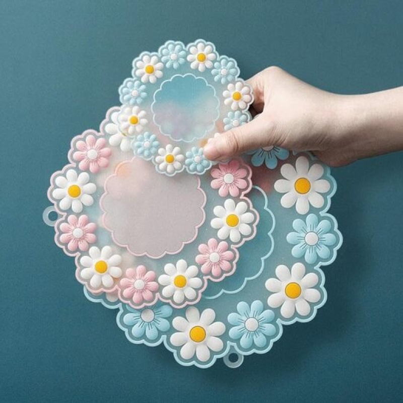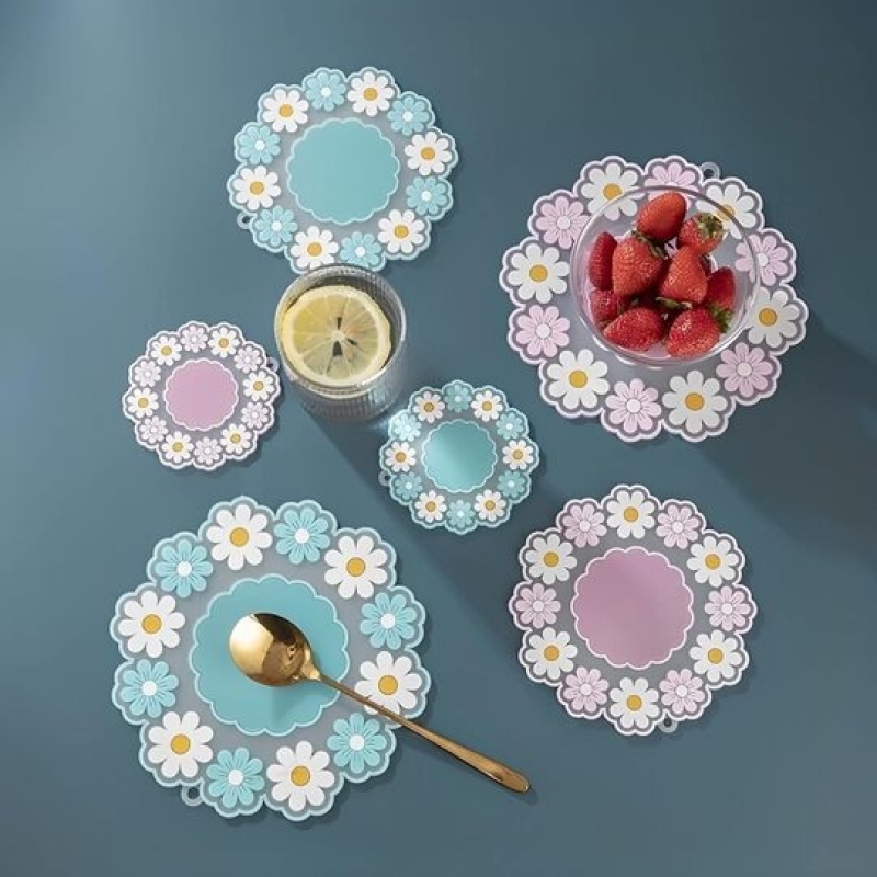 These Puno silicone flower-shaped hot mats/coasters feature a vibrant cherry blossom 3D design with subtle glitter, adding both style and practicality to your home. Made from durable, heat-resistant, food-safe silicone, they protect tables and countertops from heat and scratches. Easy to clean and dishwasher safe, this set of three (Small, Medium, Large) is suitable for cups, mugs, bottles, cookware, and serves as functional décor for home, office, restaurants, and bars.