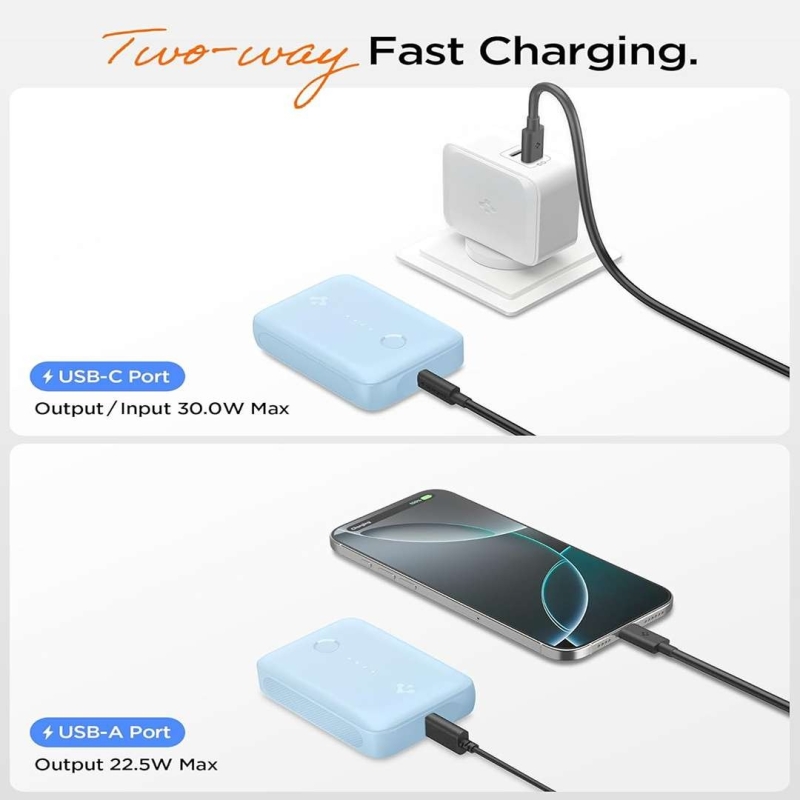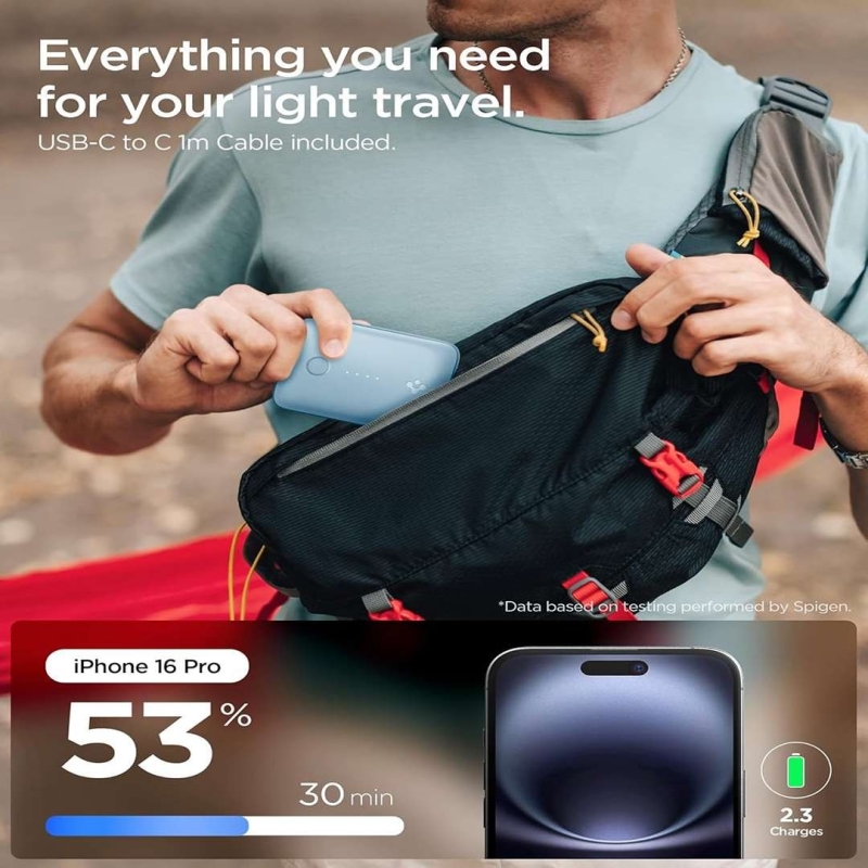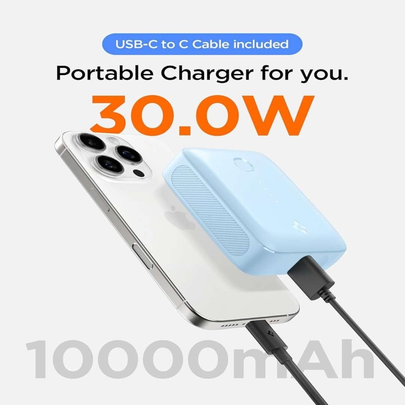 The Spigen 10000mAh Power Bank (PA2402) in Cream Blue is a pocket-sized, portable charger with a built-in USB-C cable and 30W fast charging support. It ensures safe and convenient charging on-the-go for smartphones, tablets, and laptops, having passed 22 safety tests.