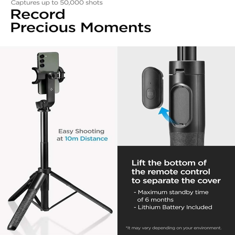 The Spigen Lightweight Selfie Stick is a versatile and portable accessory designed for smartphones and action cameras. Built with premium materials and a secure rubber-coated grip, it offers stable mounting, smooth handling, and flexible shooting with a 360° rotating ball head. Its extendable design makes it ideal for selfies, vlogging, travel, and group shots, while long-lasting battery support ensures reliable remote use.