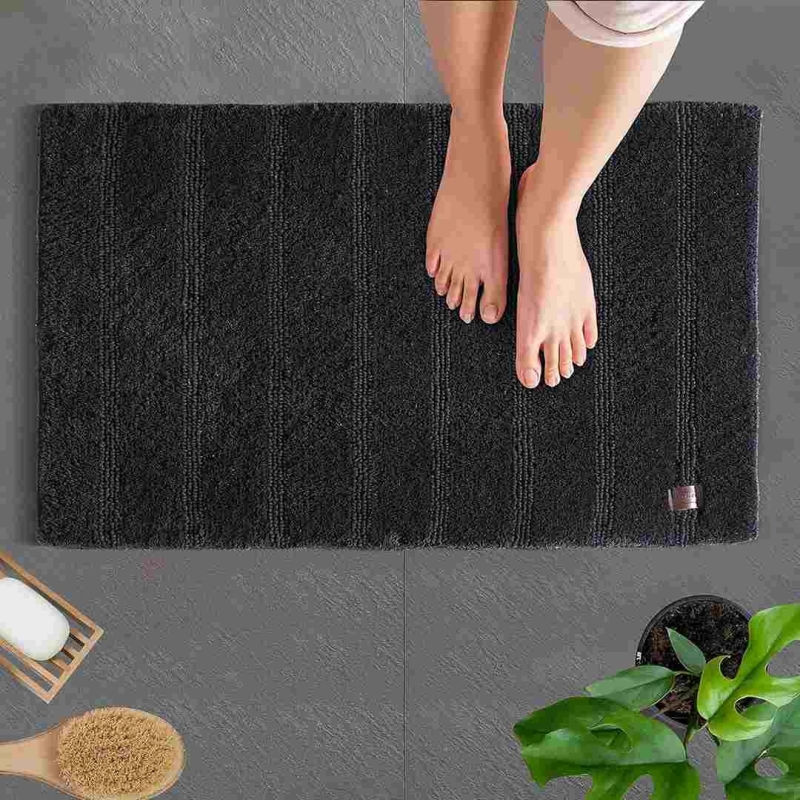 The Spread Spain Black Bathmat is a luxurious, high-pile, 100% cotton mat with ultra-soft 2700 GSM absorbency. Machine-made and reversible, it is suitable for bathrooms, kitchens, bedrooms, and even as a premium entryway mat. With non-slip backing, long-lasting colors, and zero fiber loss, it combines comfort, durability, and multifunctional use in one elegant striped design.