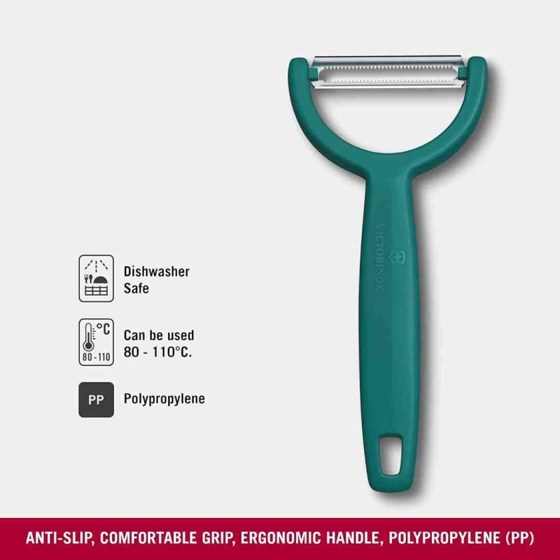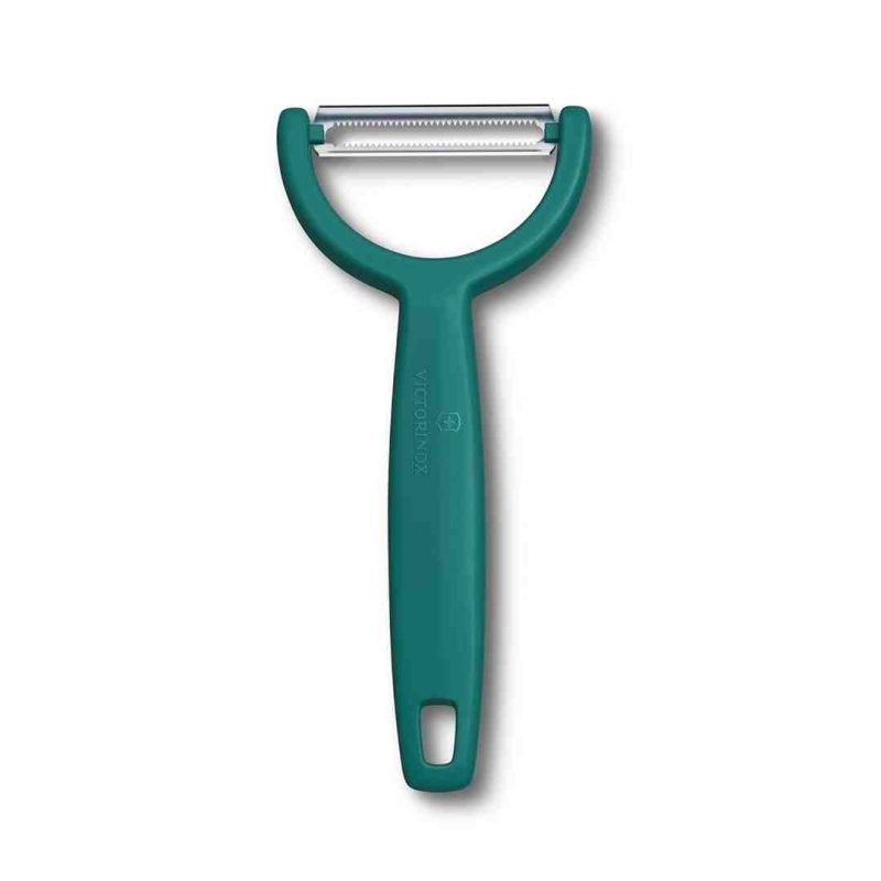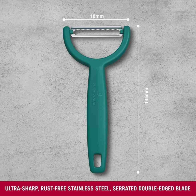 The Victorinox Swiss Classic Peeler in green features a 316L surgical grade stainless steel serrated blade that is ultra-sharp and rust-resistant. Its ergonomic polypropylene handle offers a comfortable grip, designed specifically for peeling long fruits and vegetables like cucumbers and carrots with precision and minimal waste. Lightweight and durable, this manual peeler is suitable for professional and home use, backed by a lifetime warranty.